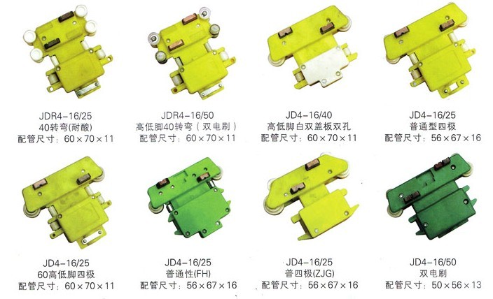JD系列滑觸線集電器是滑線系統(tǒng)中最主要的部件之一。集電器是滑觸線系統(tǒng)中集電側(cè)拾取電能的主要裝置,滑觸線集電器通過(guò)集電刷與導(dǎo)軌的滑動(dòng)接觸,將電能直接傳導(dǎo)至用電器,從而實(shí)現(xiàn)系統(tǒng)的移動(dòng)供電。集電器由機(jī)械結(jié)構(gòu)的張力裝置和直接與導(dǎo)軌滑動(dòng)接觸的集電刷兩部分組成。